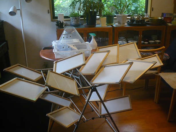 木枠に絽を ツイート 昨日は14個の木枠に絽を貼る作業をしました。 絽の生地から木枠に合った裁断をし、アラビア糊で貼って行きます。 最近は速乾方式でストーブで迅速に乾燥させます。 完全に乾燥させてから霧吹きをして、今度は自然乾燥させます。 乾燥すれば完成です。 写真は霧吹きをしてからの自然乾燥です。 2021年6月19日 九保九工房