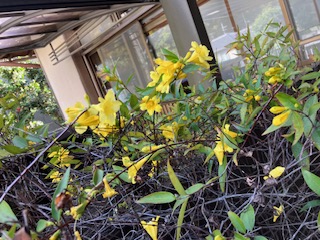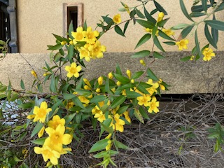 ガレージのフェンスのキャロラインジャスミンの花が咲きました。