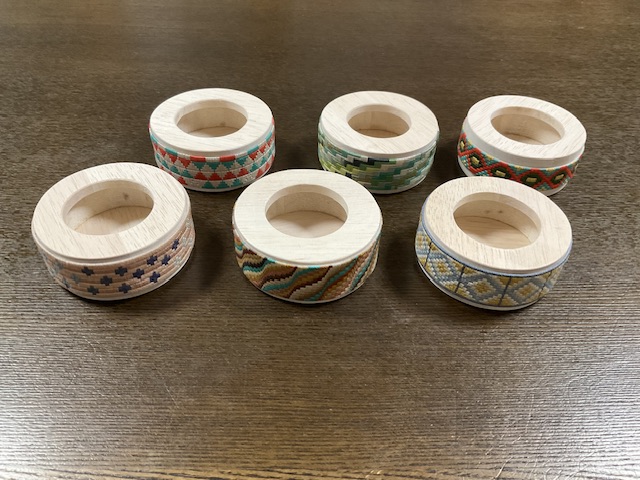 絽刺しの糸屑入れ ツイート 昨日は絽刺しの糸屑入れ6個の、仕上げをしました。 前日に木工部分の土台を作っておきました。 土台の周囲を研磨して、あしらう絽刺しの長さに合わせるようにします。 合うまで研磨したら絽刺しを貼り付けます。 乾燥して出来上がりです。 2023年9月2日 九保九工房